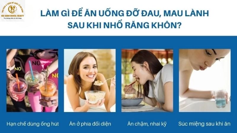 - Lưu ý: Dù vết thương đã ổn định, bạn vẫn nên tránh các món quá dai, quá cứng, hoặc thức ăn có nhiều mảnh vụn nhỏ (như bắp rang bơ, bánh quy giòn) cho đến khi vết thương lành hẳn để tránh làm tổn thương vùng nhổ răng.