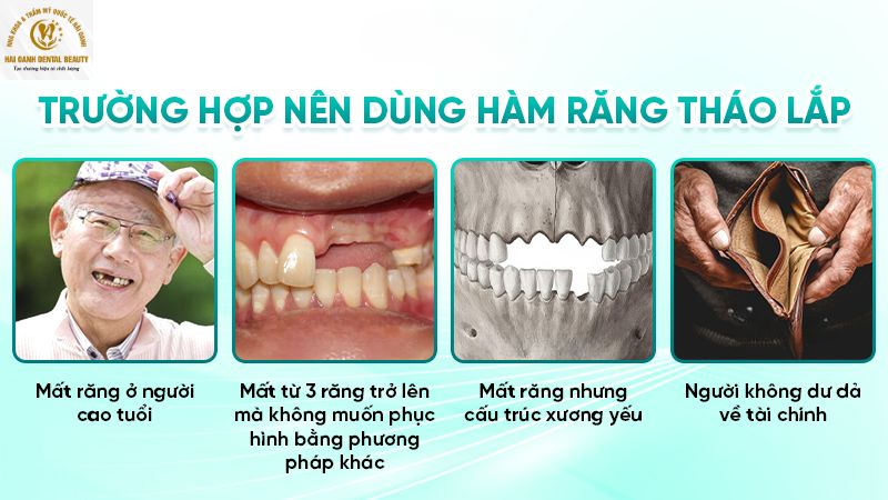 Hàm răng tháo lắp là một lựa chọn tốt, tiết kiệm cho người mất nhiều răng hay toàn hàm. Sau đây là những trường hợp lý tưởng để sử dụng hàm răng tháo lắp: