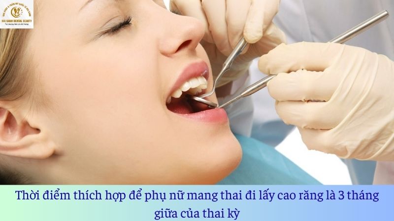 Thời điểm thích hợp để phụ nữ mang thai đi lấy cao răng là 3 tháng giữa của thai kỳ (từ tháng thứ 4 – đến thứ 6 của thai kỳ). Đây là thời điểm lý tưởng để mẹ bầu lấy cao răng vì thai nhi đã ổn định, cơ thể mẹ ổn định, không còn bị ốm nghén như thời gian đầu. Bên cạnh đó, mẹ bầu những tháng giữa thai kỳ cũng chưa quá “nặng nề” nên di chuyển thuận lợi hơn so với 3 tháng cuối thai kỳ.
