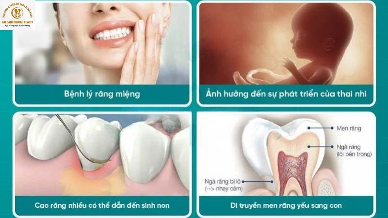 Trong giai đoạn mang thai, sự thay đổi hormone khiến nướu của phụ nữ trở nên nhạy cảm và dễ tổn thương hơn, tạo điều kiện thuận lợi cho cao răng tích tụ và gây ra các bệnh lý nguy hiểm. Tại Nha khoa Thẩm mỹ Quốc tế Hải Oanh, chúng tôi luôn nhấn mạnh tầm quan trọng của việc kiểm tra và làm sạch răng miệng định kỳ trong thai kỳ để phòng tránh những rủi ro sau:
