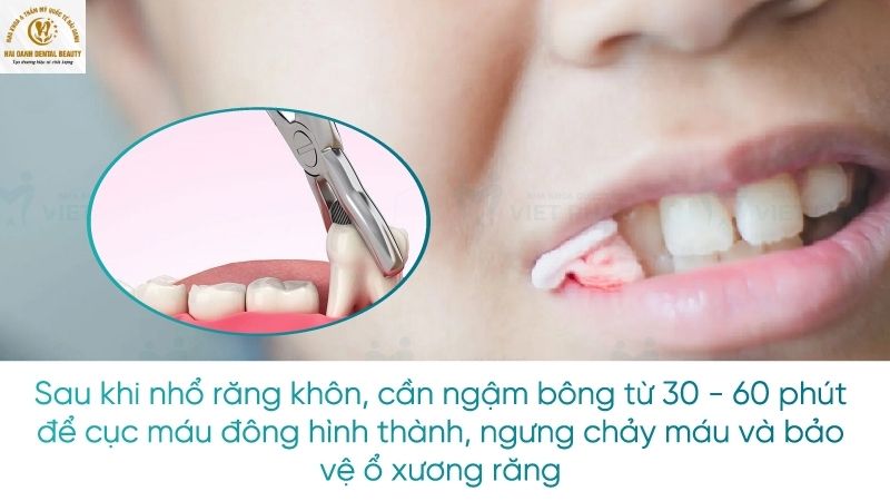 - Tầm quan trọng của bông: Ngay sau khi nhổ răng, bạn sẽ được bác sĩ đặt một miếng bông vô trùng. Hãy cắn chặt bông trong khoảng 30 - 60 phút để tạo áp lực giúp cầm máu và hình thành cục máu đông. Cục máu đông này là tấm "màng bảo vệ" không thể thiếu, giúp ngăn vi khuẩn xâm nhập và là nền tảng cho việc lành thương sau này.