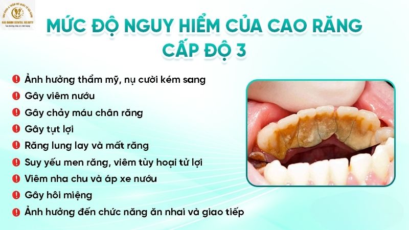 Cao răng cấp độ 3 ảnh hưởng trực tiếp đến thẩm mỹ và có thể dẫn đến những biến chứng nguy hiểm cho sức khỏe răng miệng. Cụ thể: