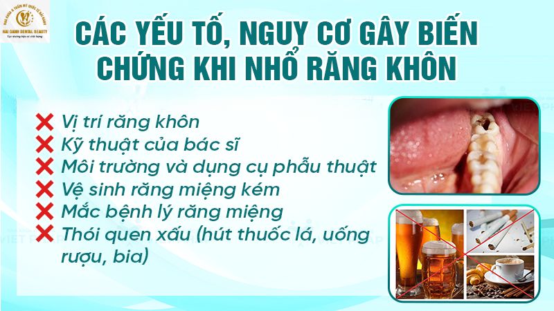 - Bệnh lý răng miệng: Các bệnh nhiễm trùng sẵn có như viêm nướu, viêm nha chu, sâu răng nghiêm trọng ở các răng kề cận có thể lây lan sang vị trí răng khôn vừa nhổ.