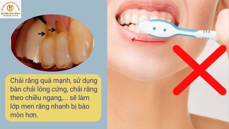 - Chải răng sai kỹ thuật: Việc dùng bàn chải lông cứng kết hợp với lực chải quá mạnh theo chiều ngang là nguyên nhân hàng đầu. Lực ma sát này dần bào mòn men răng ở vị trí cổ răng, nơi vốn đã rất mỏng.