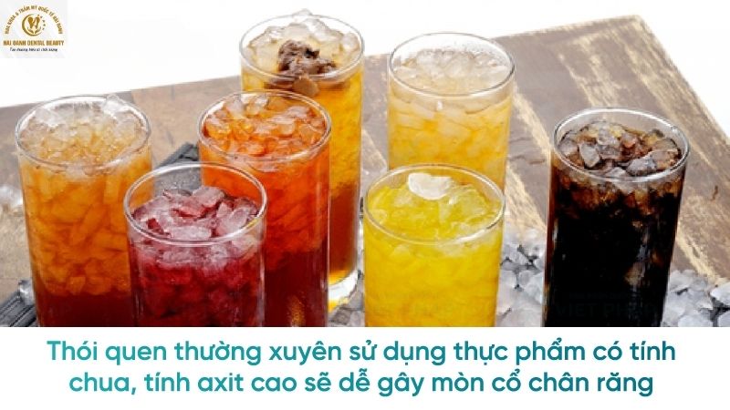 - Chế độ ăn uống: Thói quen ăn uống không lành mạnh như dùng nhiều thực phẩm, đồ uống có tính axit (nước ngọt có gas, nước chanh, rượu vang…), ăn vặt thường xuyên hoặc liên tục dùng đồ quá nóng/lạnh có thể làm men răng bị bào mòn. Lâu dần, những tác động này khiến cổ chân răng trở nên nhạy cảm, dễ tổn thương và tăng nguy cơ mòn răng.
