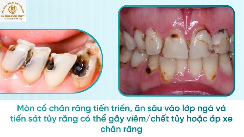 Khi tình trạng mòn cổ chân răng tiến triển, ăn sâu vào lớp ngà và tiến sát tủy răng, vi khuẩn trong khoang miệng có thể xâm nhập và gây ra những biến chứng nguy hiểm như:
