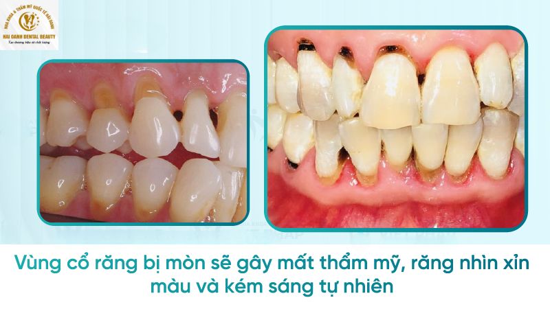 Khi vùng cổ răng bị mòn, bề mặt răng sẽ trở nên lõm sâu, lộ màu ngà vàng bên trong khiến răng nhìn xỉn màu, kém sáng tự nhiên. Đặc biệt, vùng nướu dễ bị tụt xuống dưới, làm lộ phần chân răng sẽ tạo cảm giác răng trông dài bất thường, kém hài hòa.