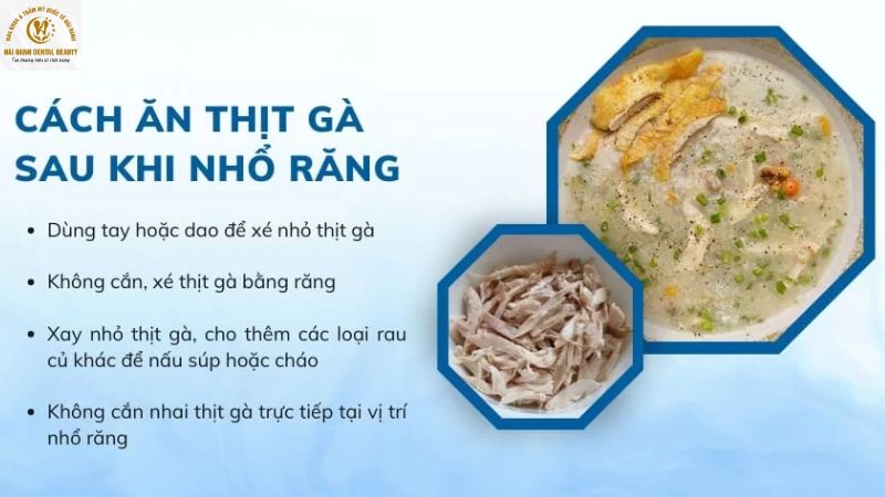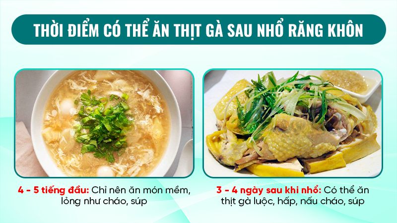 - 3 – 4 ngày sau khi nhổ răng khôn: Khách hàng có thể ăn thịt gà nhưng nên chế biến mềm như thịt gà luộc, hấp hoặc nấu cháo, súp bằng thịt gà.
