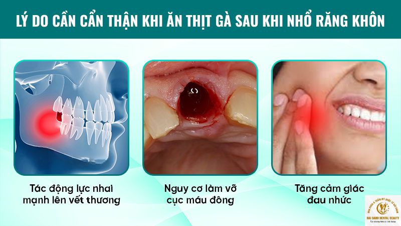 - Nguy cơ chảy máu trở lại: Khi răng khôn được nhổ, một cục máu đông sẽ hình thành tại hốc răng để bảo vệ vết thương và giúp quá trình lành thương diễn ra. Việc nhai mạnh các thức ăn dai như thịt gà có thể tạo áp lực đủ lớn để làm bung cục máu đông này. Khi đó, vết thương sẽ bị chảy máu lại, không chỉ gây đau nhức mà còn kéo dài thời gian hồi phục, thậm chí dẫn đến nguy cơ khô ổ cắm răng (dry socket), một biến chứng rất đau đớn.