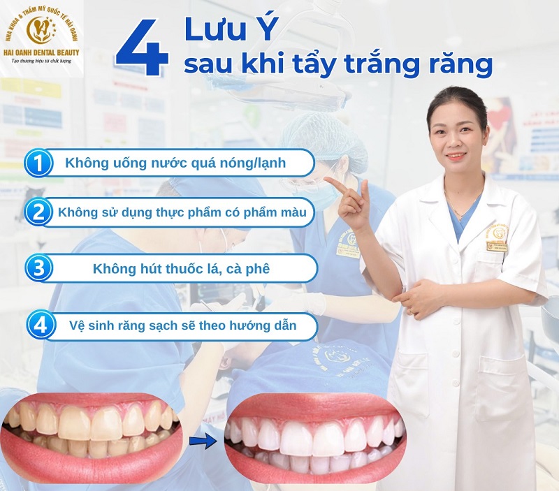 Bác sĩ sẽ tư vấn chi tiết về cách chăm sóc răng miệng cho khách hàng sau khi tẩy trắng răng. Trong vài ngày đầu, khách hàng cần tránh sử dụng các thực phẩm, đồ uống đậm màu như cà phê, trà, nước ngọt có gas. Đồng thời, sử dụng kem đánh răng không có chất mài mòn, đánh răng nhẹ nhàng và hạn chế các thói quen xấu gây hại men răng.