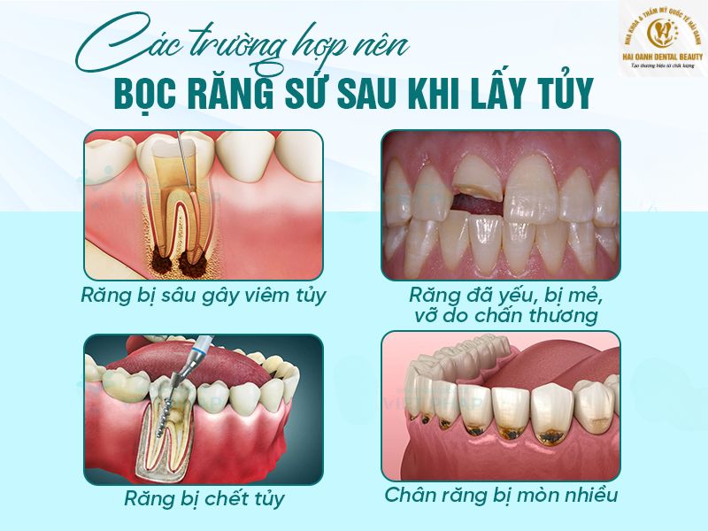 - Răng bị sâu gây viêm tủy: Khi răng bị sâu nặng, vi khuẩn sẽ xâm nhập vào bên trong răng, gây viêm tủy. Nếu không điều trị kịp thời, tủy răng sẽ chết và gây ra nhiều biến chứng nguy hiểm. Sau khi lấy tủy, răng sẽ trở nên giòn và dễ vỡ. Bọc răng sứ sẽ giúp bảo vệ phần răng còn lại, ngăn ngừa tình trạng răng vỡ và nhiễm trùng.