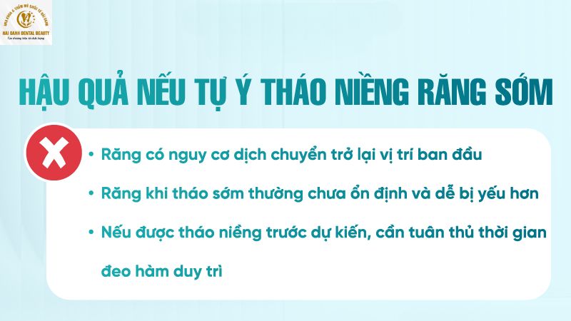 - Trong trường hợp đặc biệt, nếu bác sĩ chỉ định tháo niềng trước thời điểm dự kiến, khách hàng cần tuân thủ nghiêm ngặt việc đeo hàm duy trì ít nhất 20 giờ mỗi ngày theo đúng hướng dẫn. Đây là biện pháp quan trọng để duy trì ổn định hàm răng, hạn chế nguy cơ răng dịch chuyển và tái lệch sau khi tháo niềng răng.