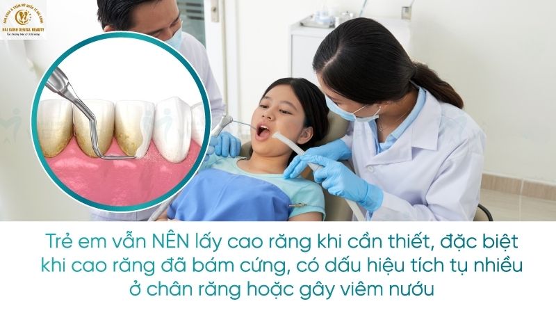 Theo bác sĩ tại Nha khoa Thẩm Mỹ Quốc Tế Hải Oanh, trẻ em vẫn NÊN lấy cao răng khi cần thiết, đặc biệt trong trường hợp cao răng đã bám cứng, có dấu hiệu tích tụ nhiều ở chân răng hoặc gây viêm nướu. Bởi vì, cao răng không phân biệt độ tuổi và có thể bắt đầu hình thành ngay từ khi trẻ mọc răng sữa và bắt đầu ăn dặm.